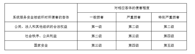 根據系統服務(wù)安全被破壞時(shí)所侵害的客體以及對相應客體的侵害程度,依據下表即可得到系統服務(wù)安全保護等級: