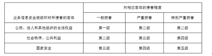根據業(yè)務(wù)信息安全被破壞時(shí)所侵害的客體以及對相應客體的侵害程度,依據下表即可得到業(yè)務(wù)信息安全保護等級: